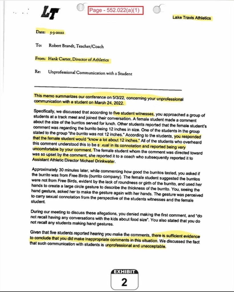 This wasn’t misinterpreted “coach talk” or a harmless joke. This was a grown man, employed by Lake Travis ISD, making overtly inappropriate sexual comments to a teenage girl under his supervision.